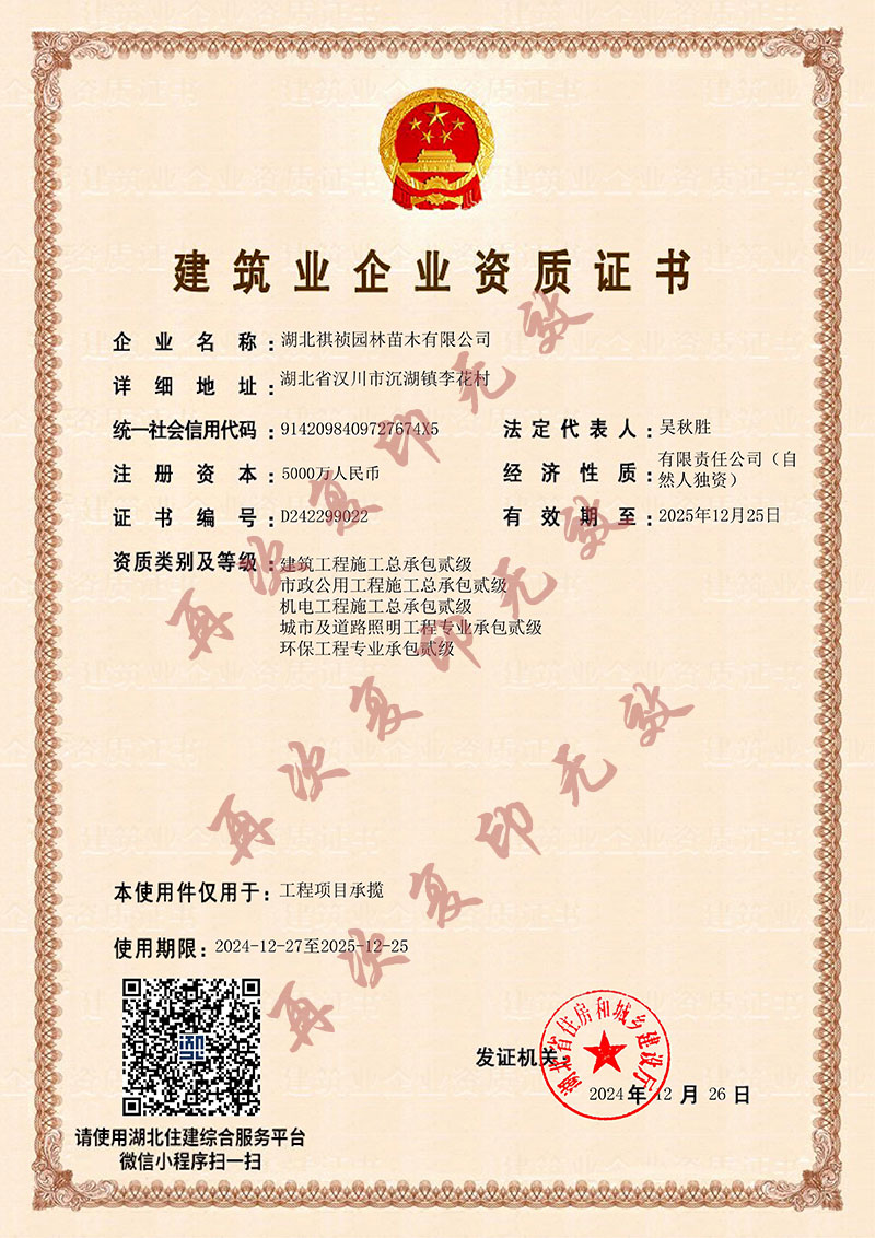 湖北祺禎園林苗木有限公司是一家專門致力于發展現代林業、苗圃花卉、旅游觀光、休閑娛樂、園林市政環保工程建設于一體的湖北省林業產業化省級龍頭企業,公司具備城市園林綠化、建筑工程施工總承包、市政公用工程施工總承包、機電工程施工總承包、城市及道路照明工程專業承包、環保工程專業承包、施工勞務資質不分等級等多項建筑業企業資質,先后獲得湖北省林業產業化省級重點龍頭企業、AAA級信用等級企業、孝感市“守合同重信用榮譽證書”、“五一勞動獎”等榮譽及質量管理、環境管理、職業健康安全管理三大體系認證。